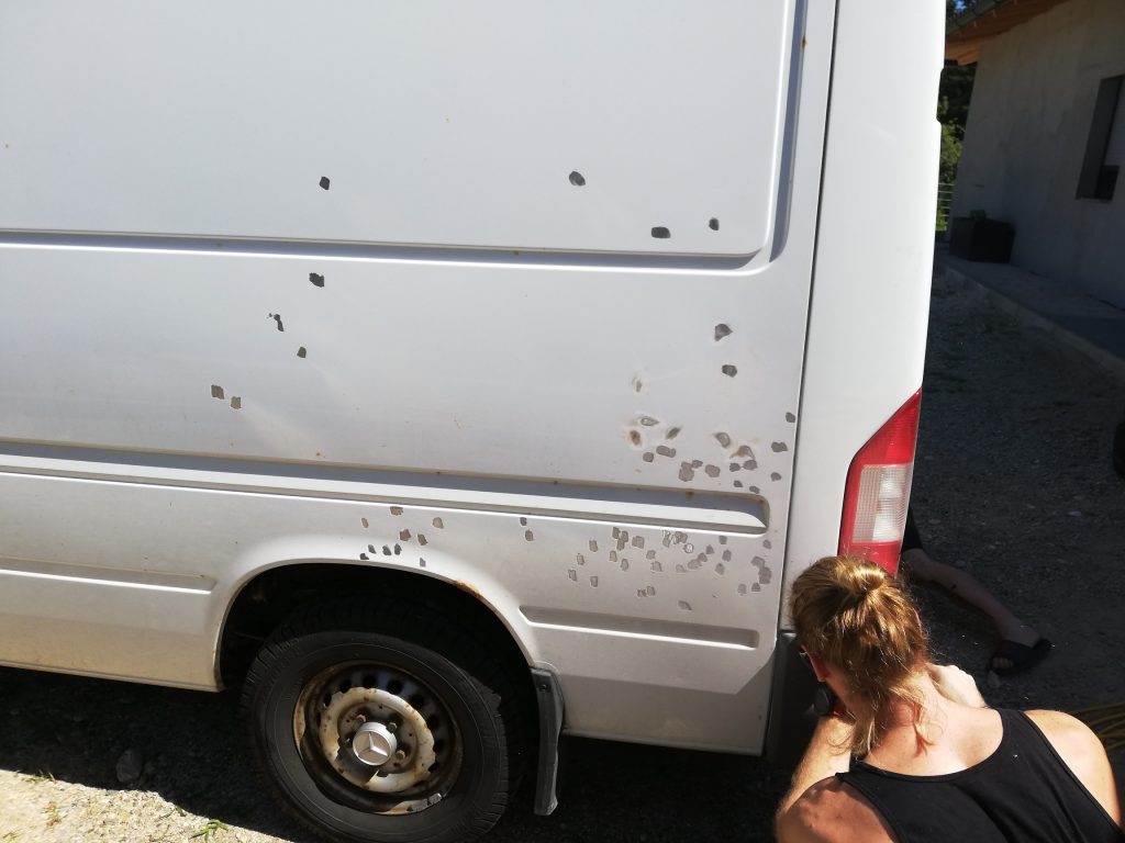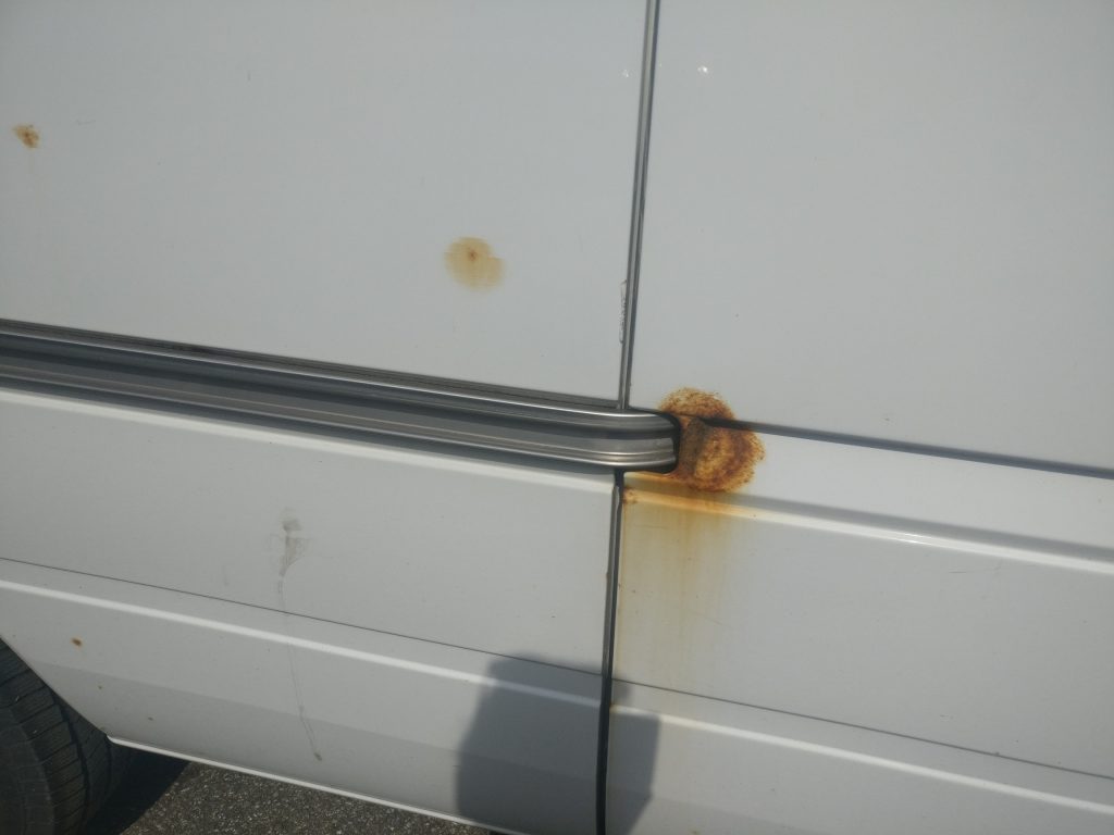 Dem gegenüber Stand das Äußere. Grob geschätzt zwei Jahre zuvor muss der Sprinter wilde Ausritte auf Schotterstraßen unternommen haben. Mit über 70 Sachen. Hinter anderen her. Die gesamte Front und die unteren Seiten sind übersät mit kleinen Steinschlägen. Aus fast allen davon blutete Rost. Aber wie die Akne in der Pubertät, vergeht auch dieser Ausschlag mit etwas Zuwendung.